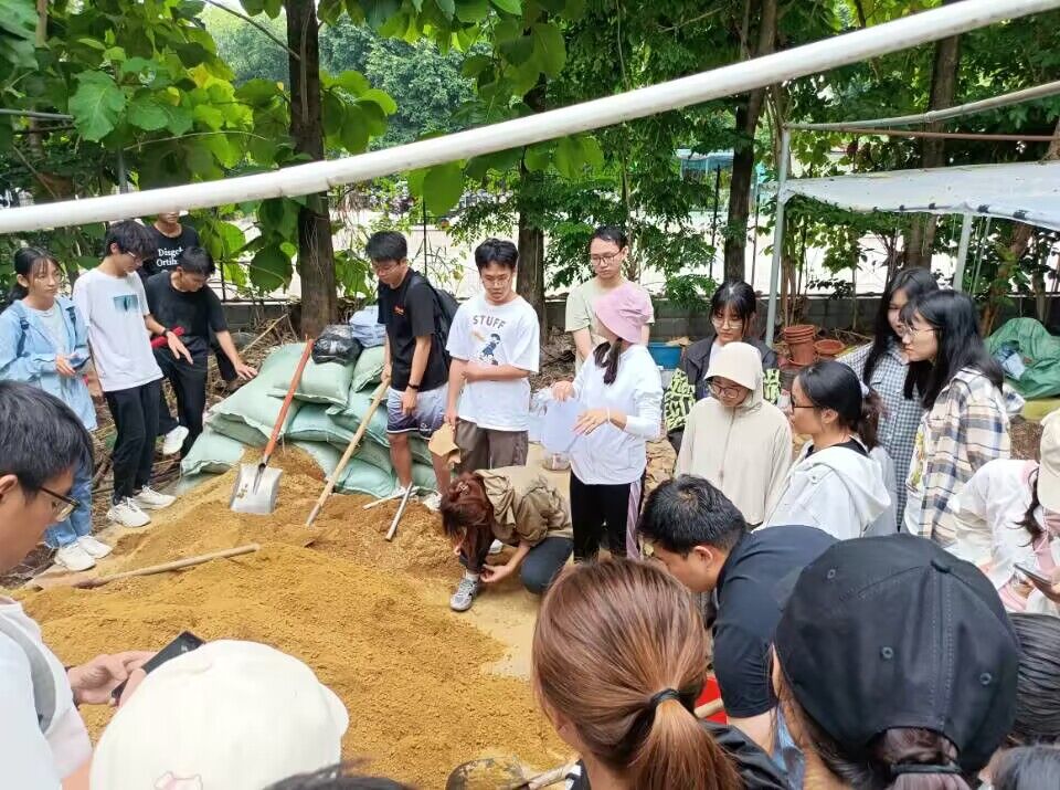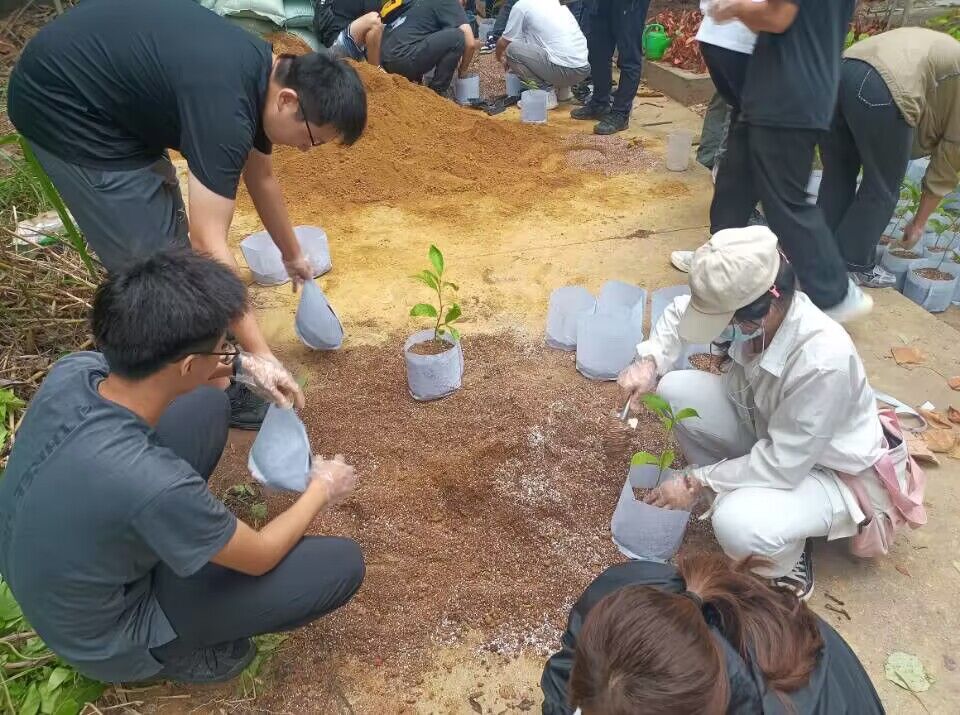 现场,班主任徐圆圆老师带领同学们参观教学实习基地苗圃,向同学们详细讲解了苗圃的组成以及容器苗培育的关键技术。紧接着,新葡的京官网2023级生态学博士研究生马道承向同学们介绍苗木种类、育苗容器和基质选择,并亲身示范育苗基质的配制及观光木容器苗的换盆移栽过程。同学们听得饶有兴致,以小组为单位,争先恐后的参与到“容器苗培育—观光木苗木换盆移栽”劳动实践活动中。