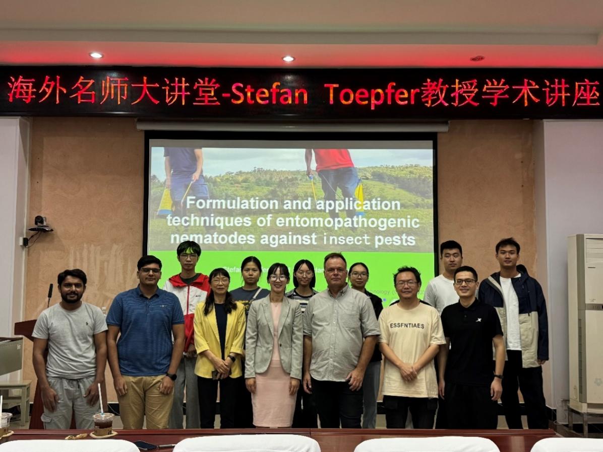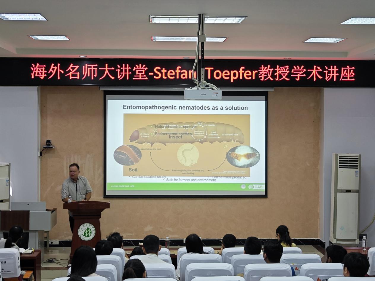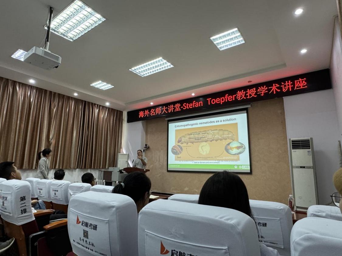 2024年10月25日上午,来自CABI(Commonwealth Agricultural Bureaux International)瑞士-匈牙利中心的世界著名植物保护专家Stefan Toepfer教授受邀做客“新葡的京集团8814登录入口海外名师大讲堂”,作“昆虫病原线虫对抗入侵性害虫的配方与应用技术”(Formulation and application techniques of entomopathogenic nematodes against invasive insect pests)新葡的京集团8814登录入口。本次报告会在新葡的京集团8814登录入口112会议室举行,新葡的京集团8814登录入口院长助理、森林保护领域青年学者胡平副教授主持报告会,农学院吴海燕教授及其团队成员、农学院植保学科的部分研究生、新葡的京集团8814登录入口研究生及森保团队师生100余人参加会议。